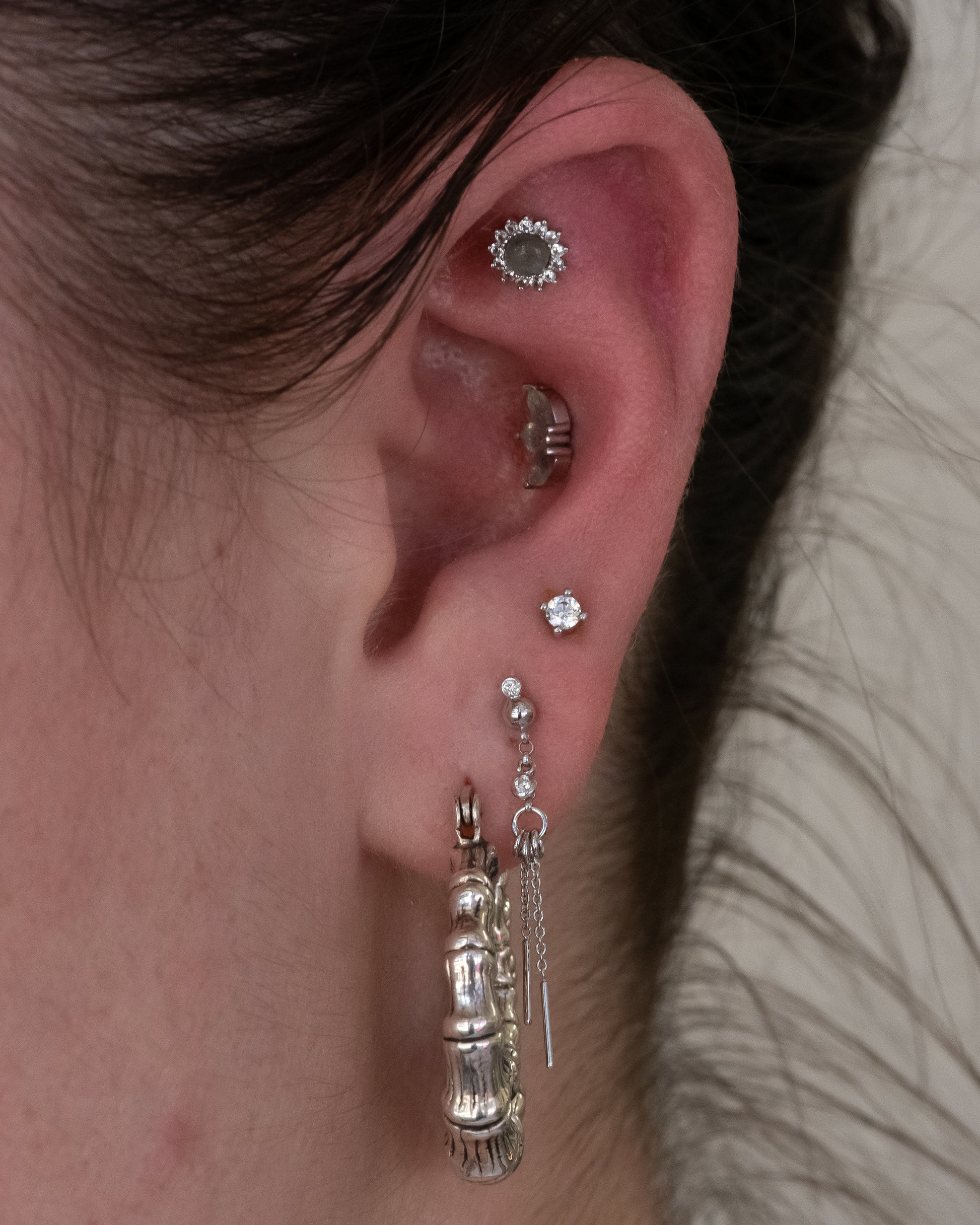 A stunning piece in 14kt gold, suitable for many placements on the ear and nostril for both initial and healed piercings.
