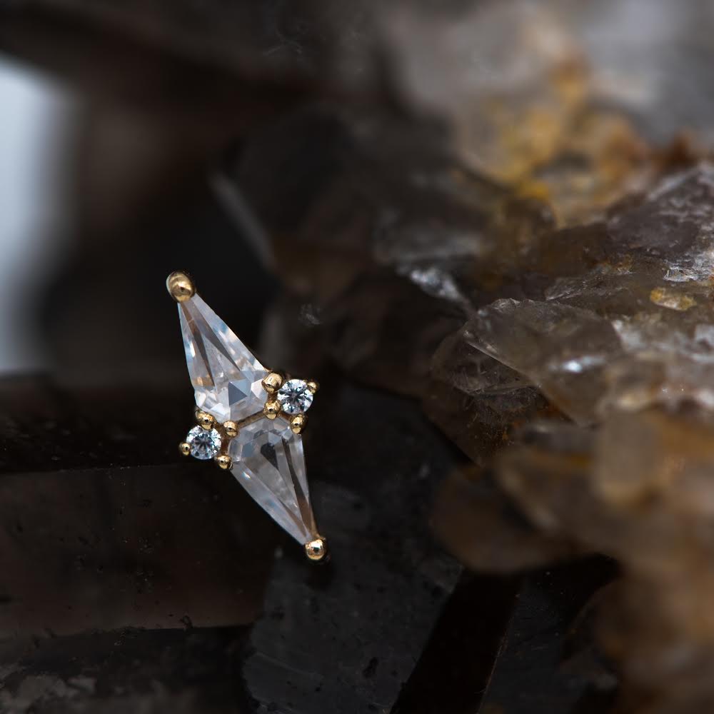 A bold & sharp piece in 14kt gold, suitable for many placements on the ear for both initial and healed piercings.